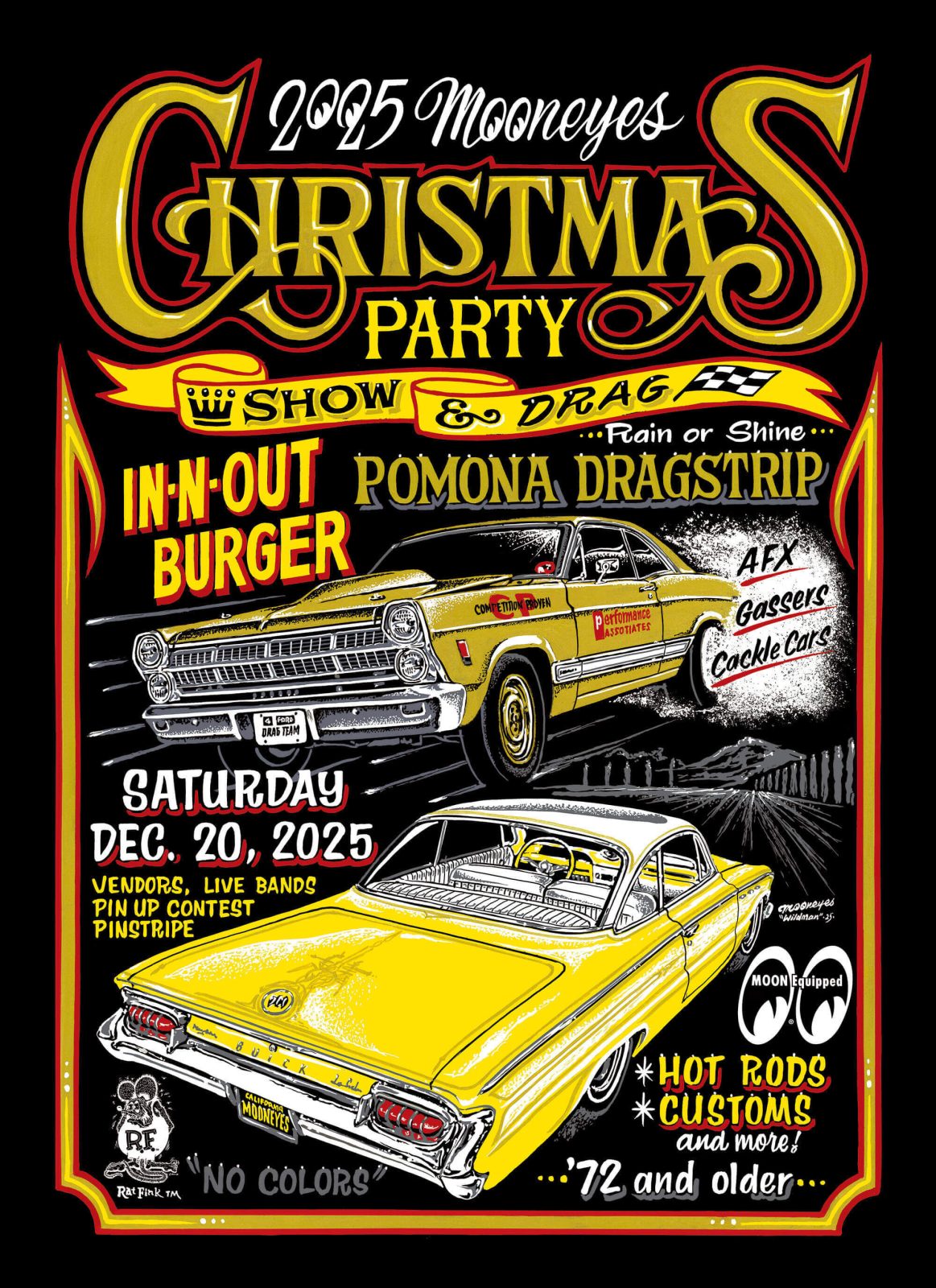 Join us for the 2025 Mooneyes Christmas Party Show & Drag at Pomona Dragstrip.